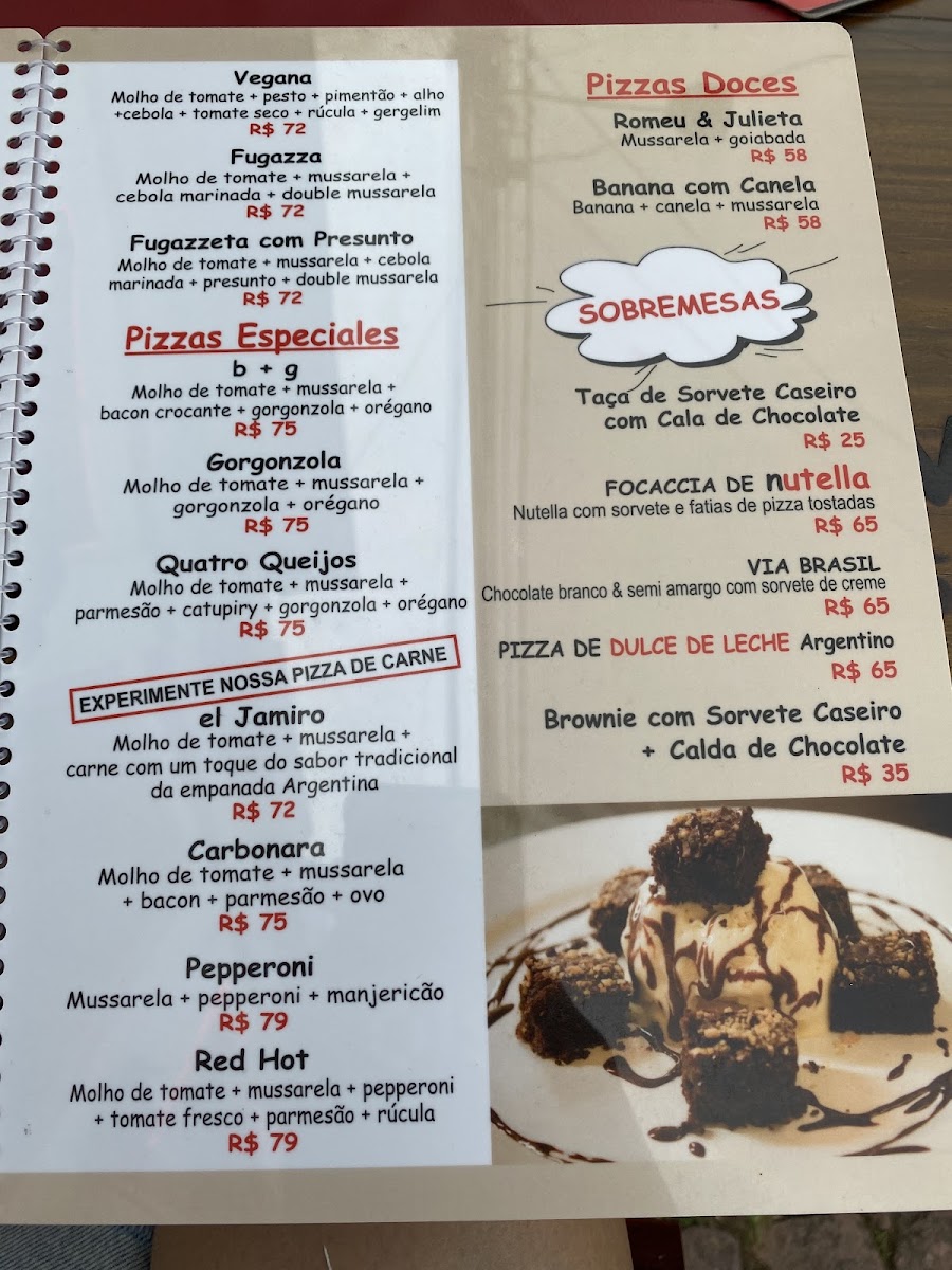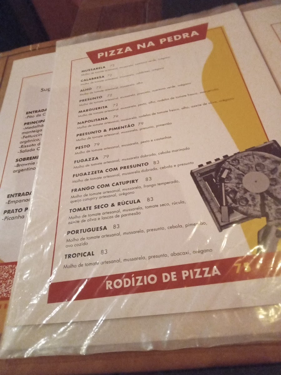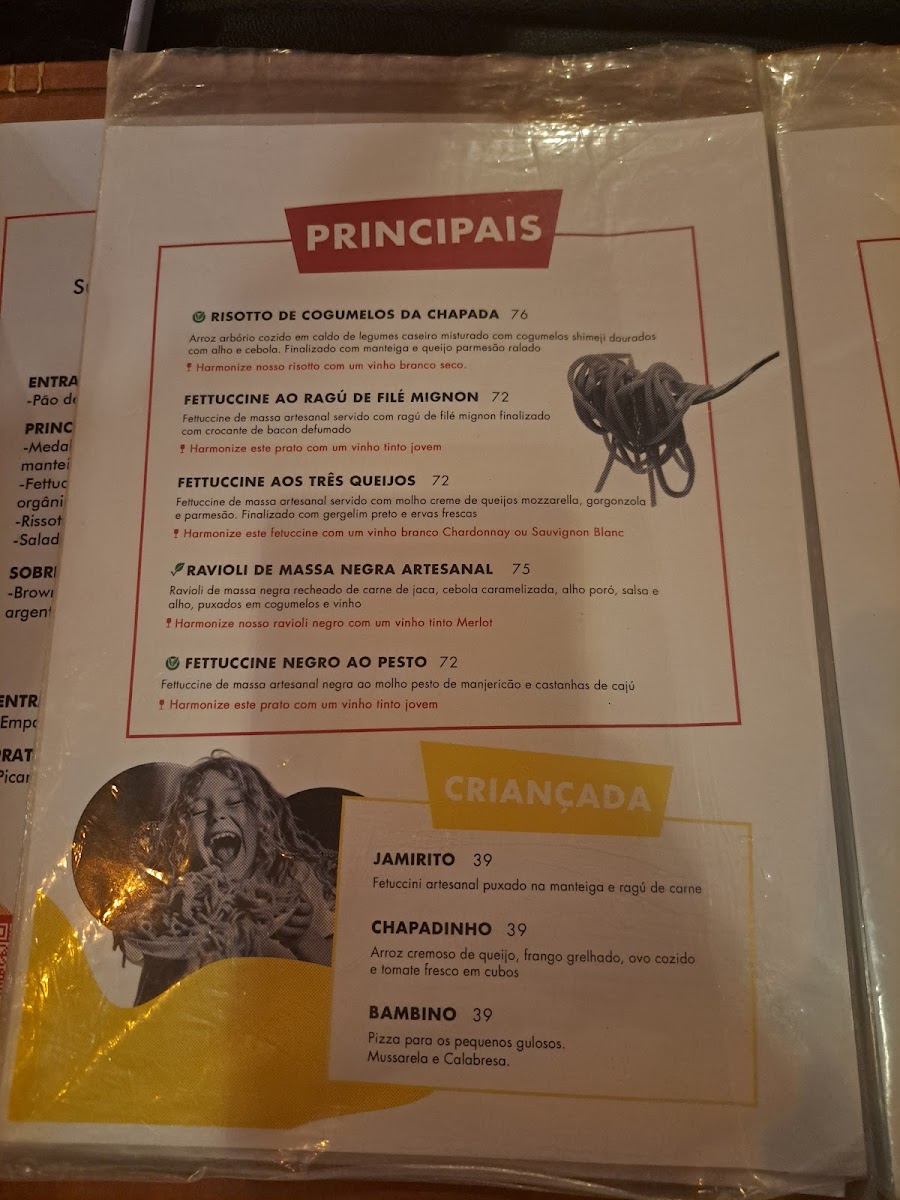 Moving to the main dishes, the Rodizio de Pizza is a highlight for pizza lovers, offering an endless variety of pizzas to satisfy your cravings. The Pizza de Rúcula Com Tomate Seco E Marguerita ao Molho Pesto combines fresh arugula and sun-dried tomatoes, perfectly complementing the classic Margherita with a pesto twist. For a more substantial meal, the Picanha Argentina and Carne do Sol A Banana da Terra are irresistible choices, both showcasing rich flavors and tender cuts of meat. The Talharim Com Medalhão de Filé Mignon and Fettuccione Com Ragu de Filé Mignon offer a delightful Italian touch, featuring succulent pieces of filet mignon in rich, savory sauces.